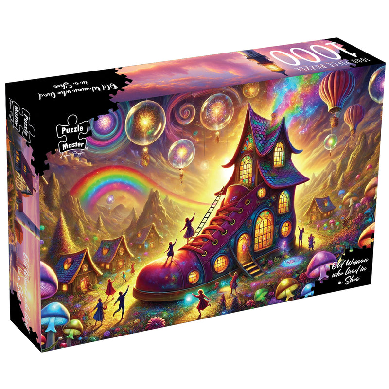 This 1000-piece puzzle brings a beloved nursery rhyme to life through a vibrant, imaginative scene. At its centre stands a magical shoe-shaped house glowing with warmth, surrounded by playful children and a world filled with wonder. Hot air balloons drift through the sky, rainbows arc overhead, and floating lanterns illuminate the scene, creating a joyful and enchanting fairytale setting.