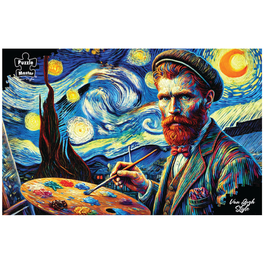 Immerse yourself in the vibrant and expressive world of Vincent van Gogh with the Puzzlemaster 1000-Piece Jigsaw Puzzle - "Van Gogh Selfie." This mesmerizing puzzle features a modern artistic interpretation of the legendary artist, blending his iconic Starry Night with a striking self-portrait. Bursting with swirling colors and bold brushstrokes, this puzzle is perfect for art lovers, history buffs, and creative minds alike.